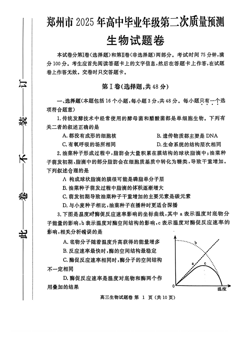 河南省郑州市2025届高中毕业年级第二次质量预测(郑州二模)生物+答案
