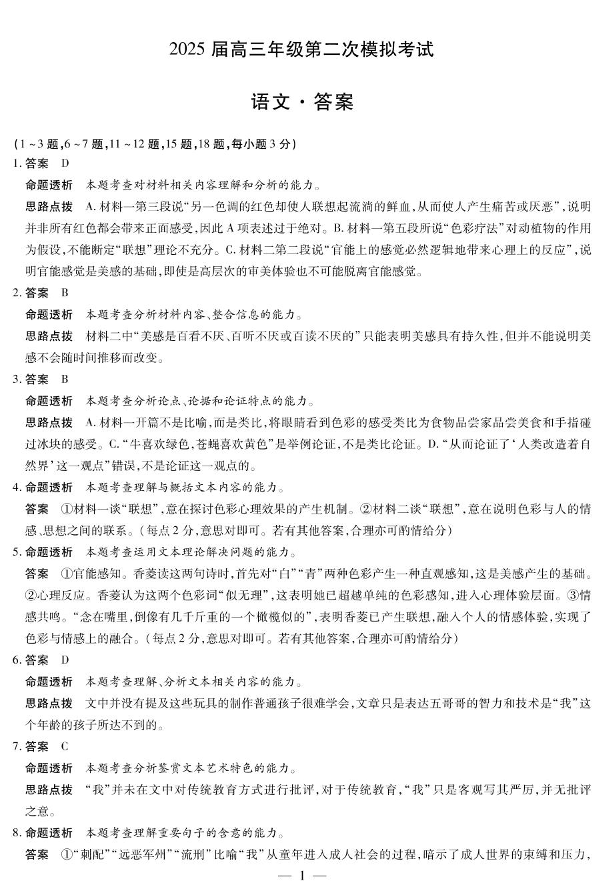河南天一大联考2025届高三3月联考(安阳、鹤壁、焦作、濮阳)高三第二次模拟考试语文答案