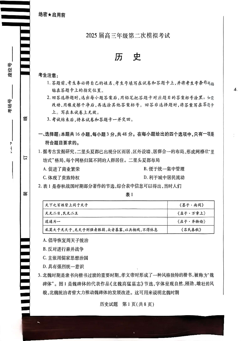 河南天一大联考2025届高三3月联考(安阳、鹤壁、焦作、濮阳)高三第二次模拟考试历史+答案