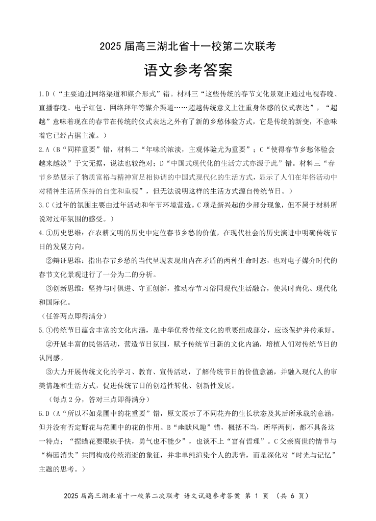 湖北省十一校2025届高三第二次联考语文答案