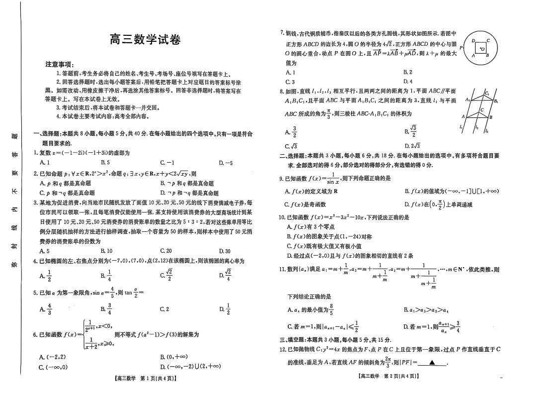 江西省金太阳三新教研共同体2025届高三3月联考数学+答案