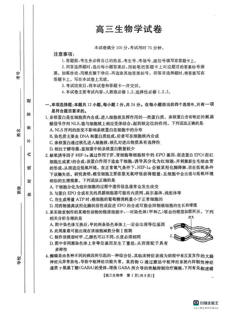 江西省金太阳三新教研共同体2025届高三3月联考生物+答案