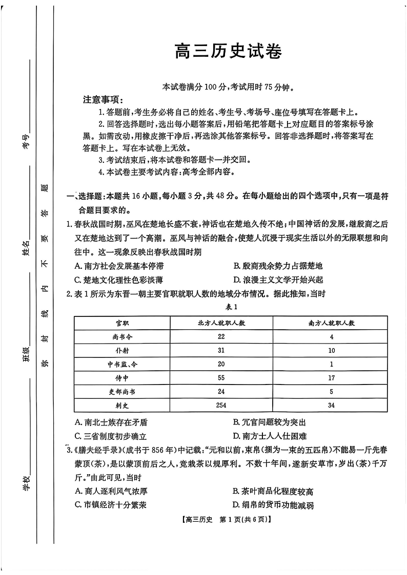 江西省金太阳三新教研共同体2025届高三3月联考历史+答案