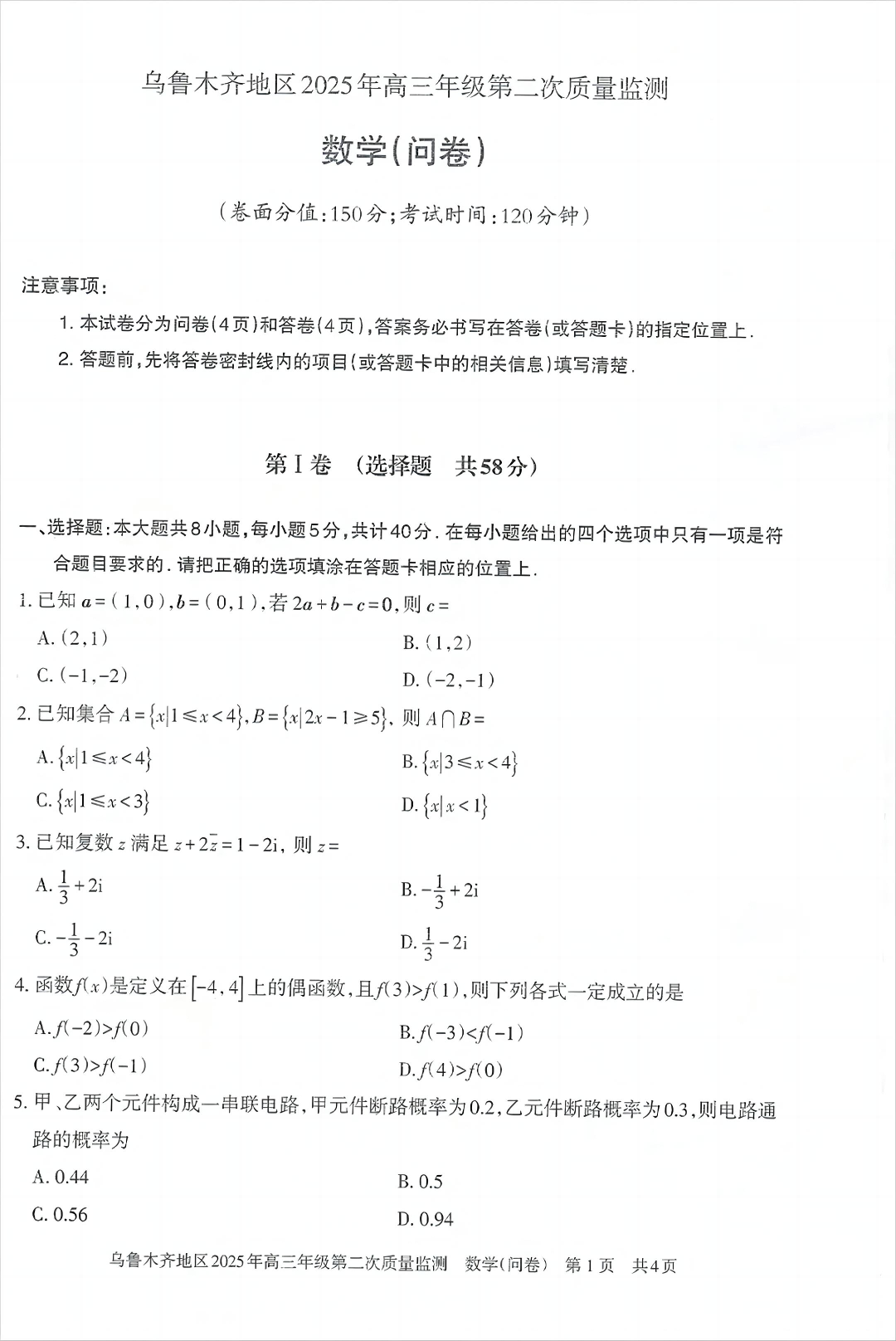 新疆乌鲁木齐地区2025年高三年级第二次质量监测(乌鲁木齐二模)数学