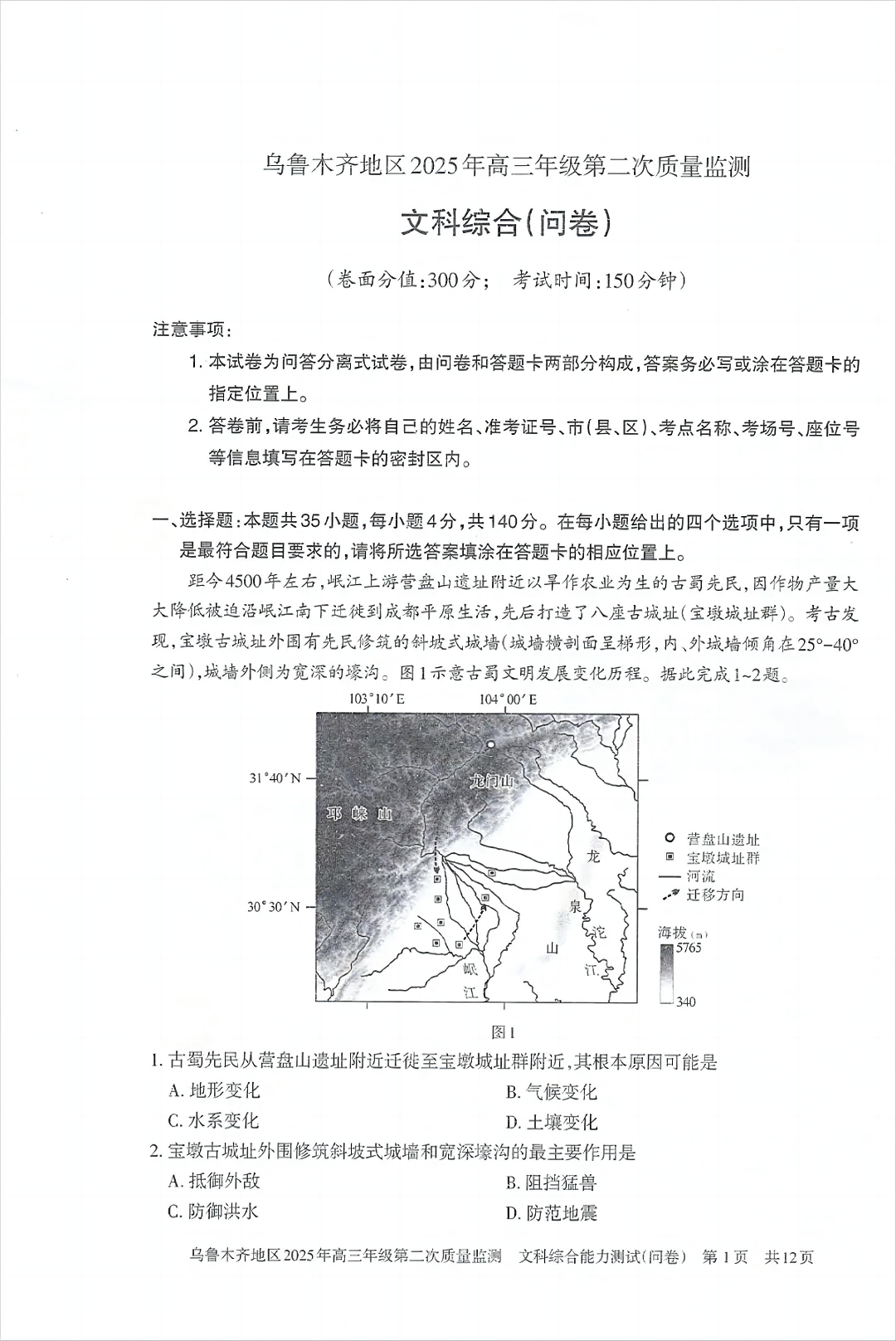 新疆乌鲁木齐地区2025年高三年级第二次质量监测(乌鲁木齐二模)文综