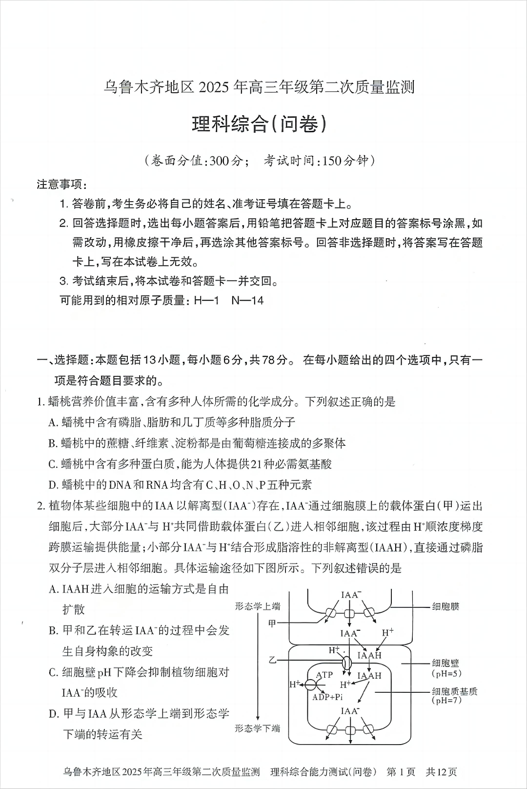 新疆乌鲁木齐地区2025年高三年级第二次质量监测(乌鲁木齐二模)理综