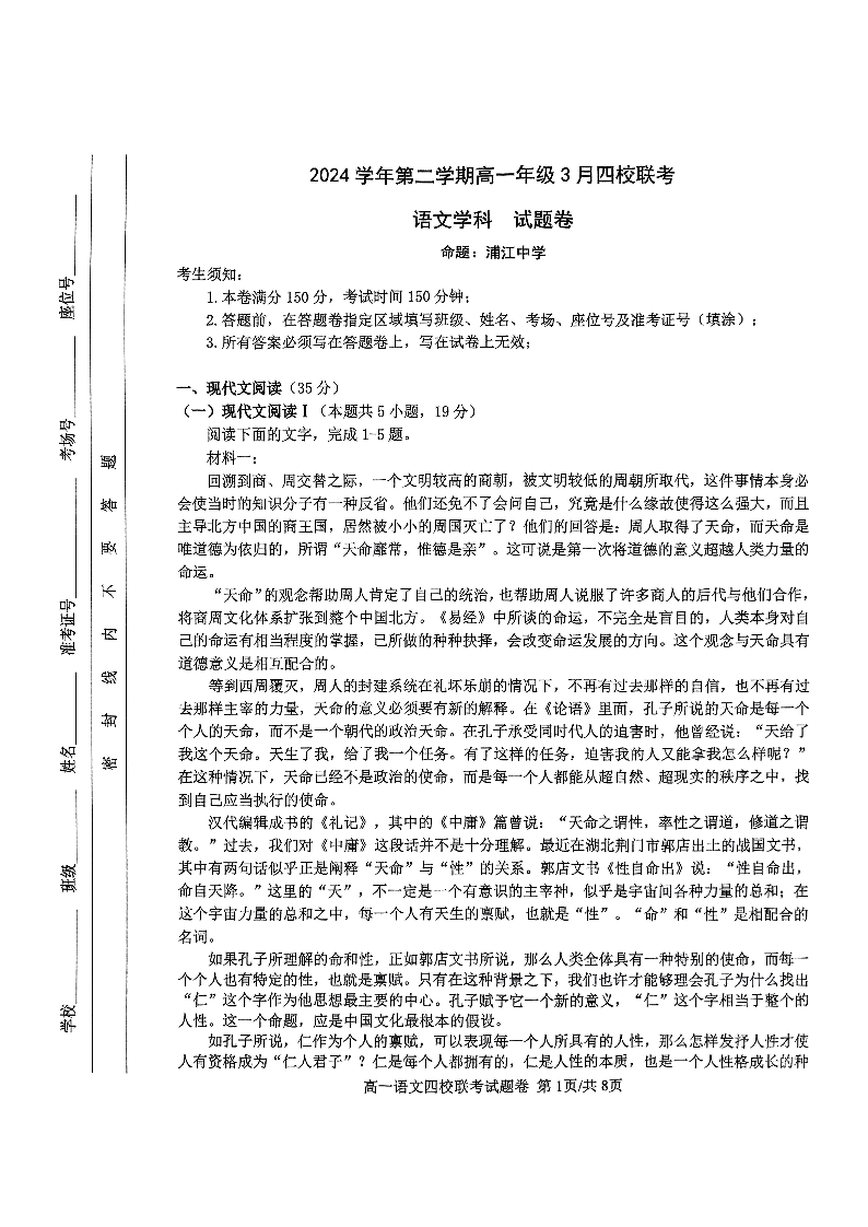 浙江省四校2024-2025学年下学期3月高一月考语文