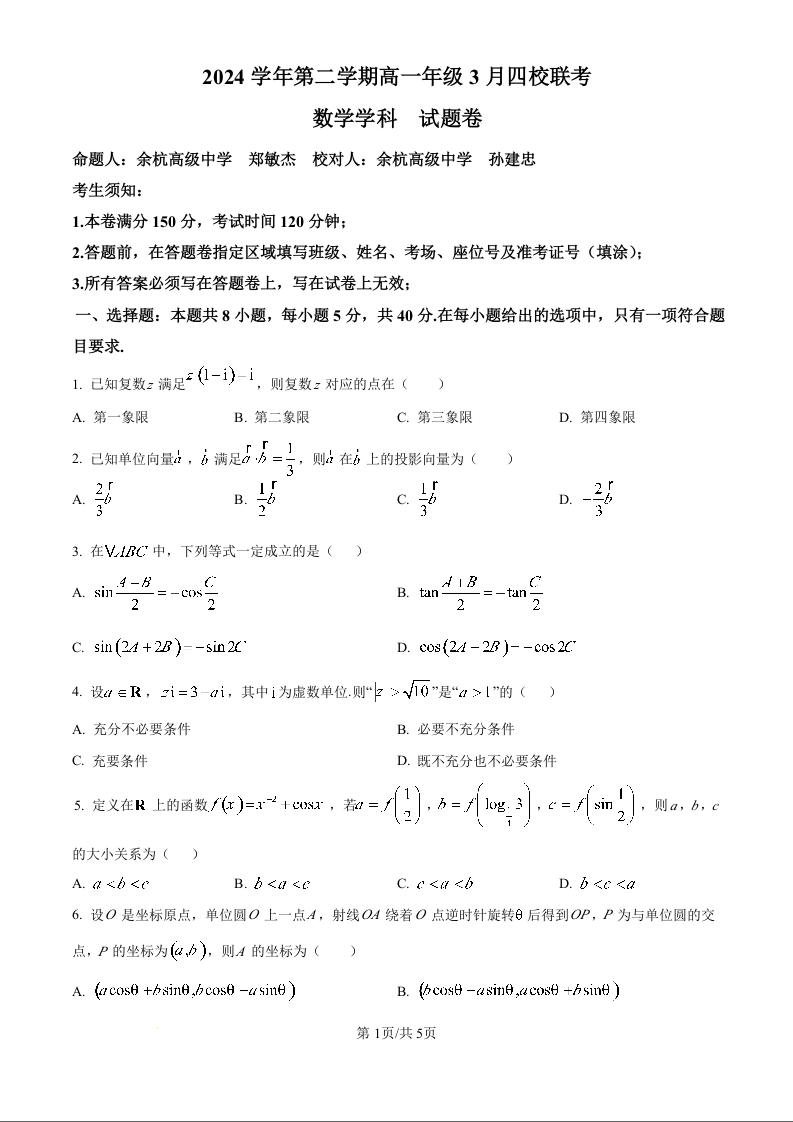 浙江省四校2024-2025学年下学期3月高一月考数学(原卷版)