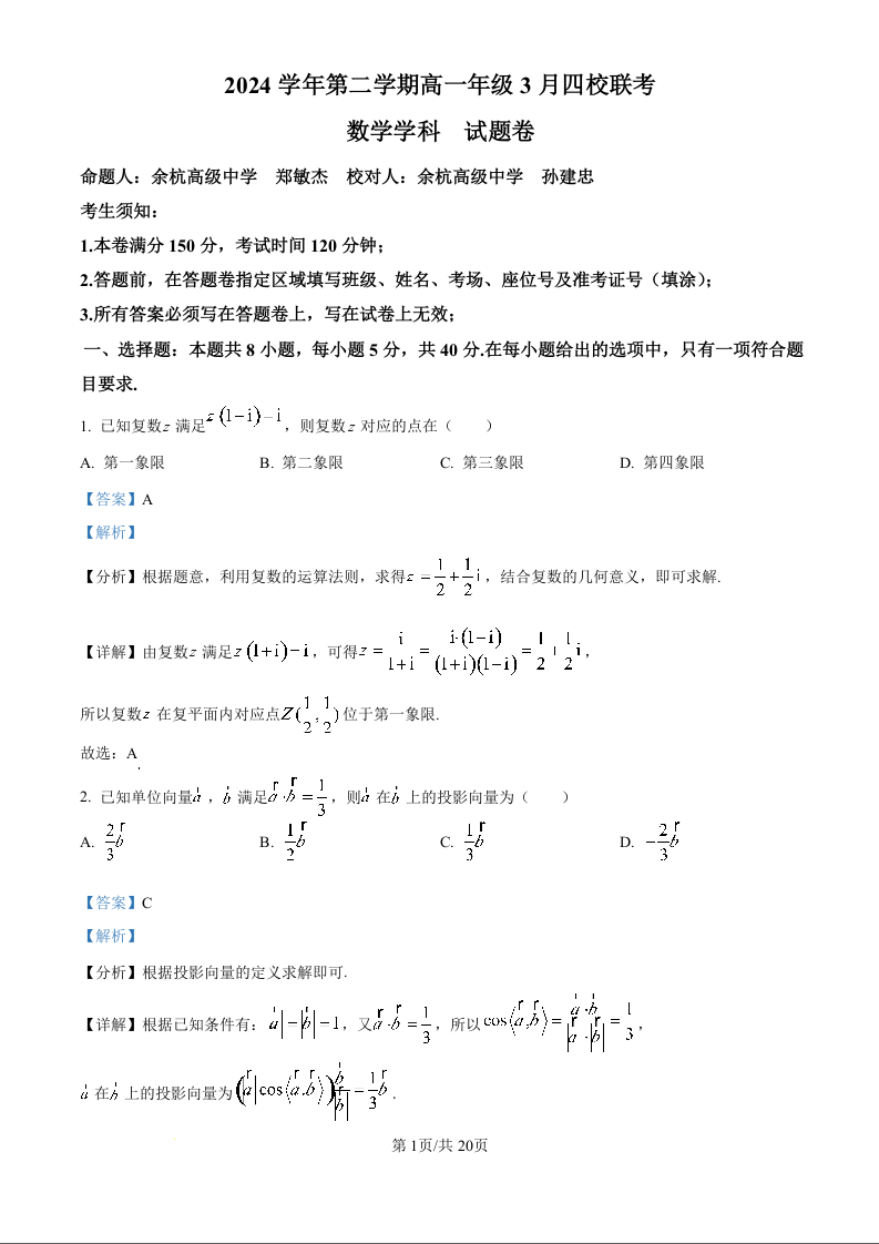 浙江省四校2024-2025学年下学期3月高一月考数学(精品解析版)