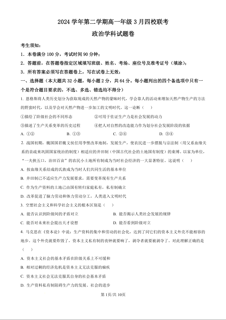 浙江省四校2024-2025学年下学期3月高一月考政治(原卷版)