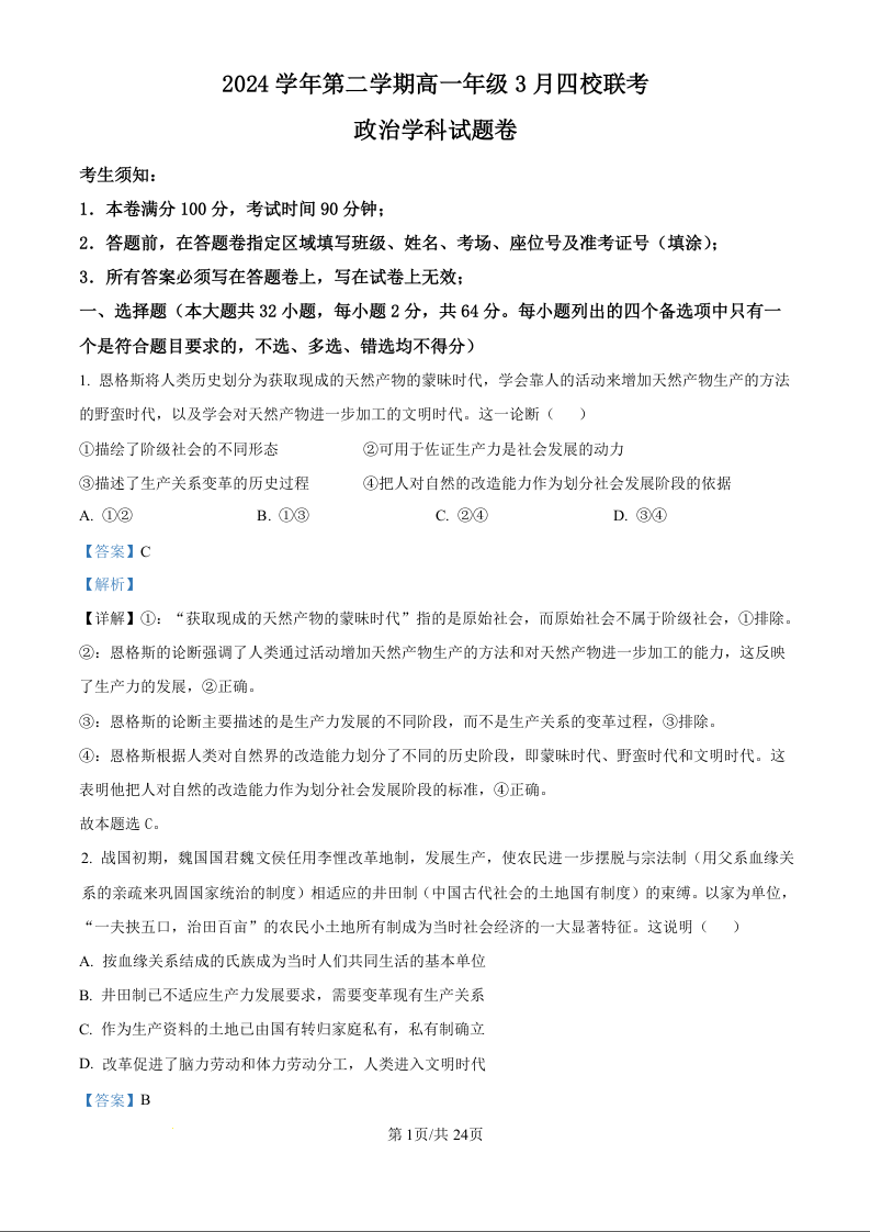 浙江省四校2024-2025学年下学期3月高一月考政治(精品解析版)