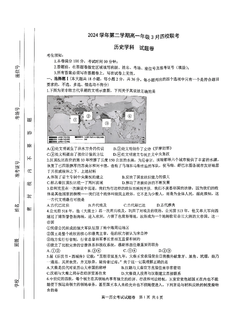 浙江省四校2024-2025学年下学期3月高一月考历史