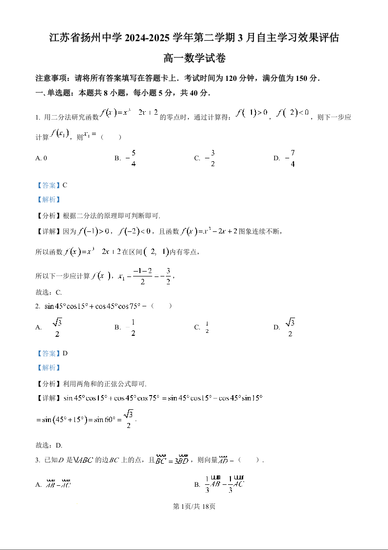 江苏省扬州中学2024-2025学年下学期3月高一月考数学(精品解析版)