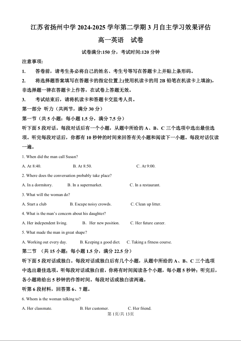 江苏省扬州中学2024-2025学年下学期3月高一月考英语(原卷版)