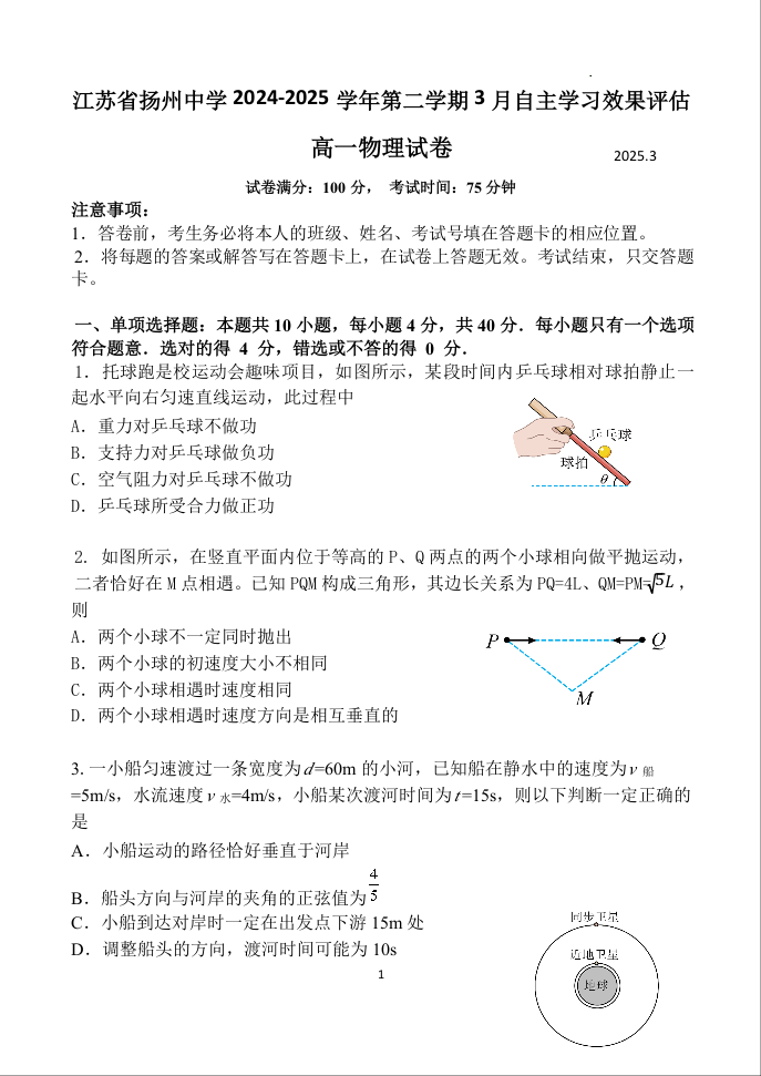 江苏省扬州中学2024-2025学年下学期3月高一月考物理+答案