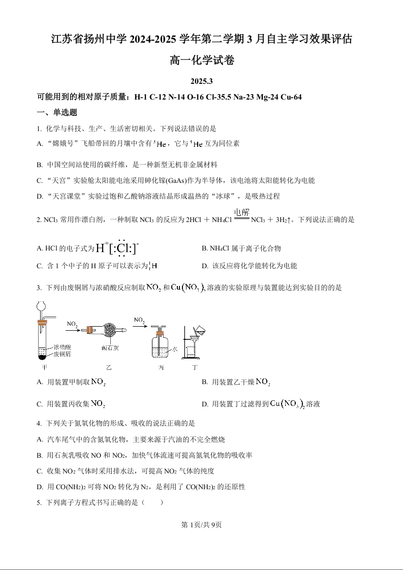 江苏省扬州中学2024-2025学年下学期3月高一月考化学(原卷版)