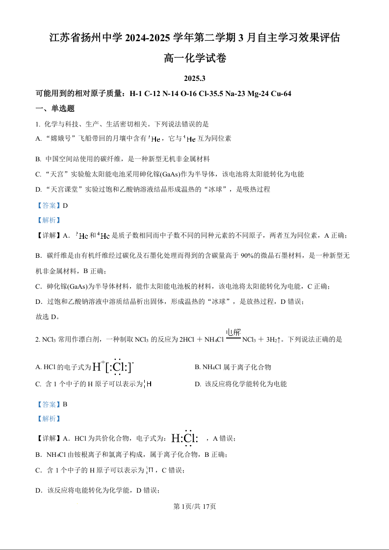江苏省扬州中学2024-2025学年下学期3月高一月考化学(精品解析版)