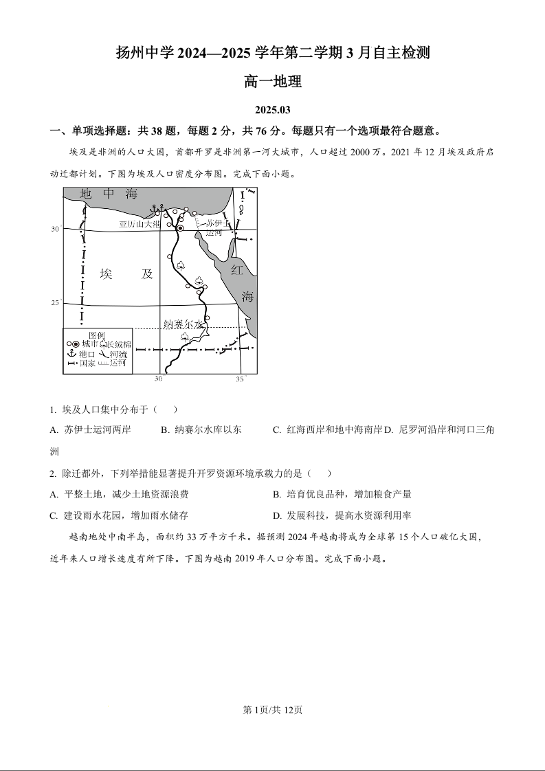 江苏省扬州中学2024-2025学年下学期3月高一月考地理(原卷版)