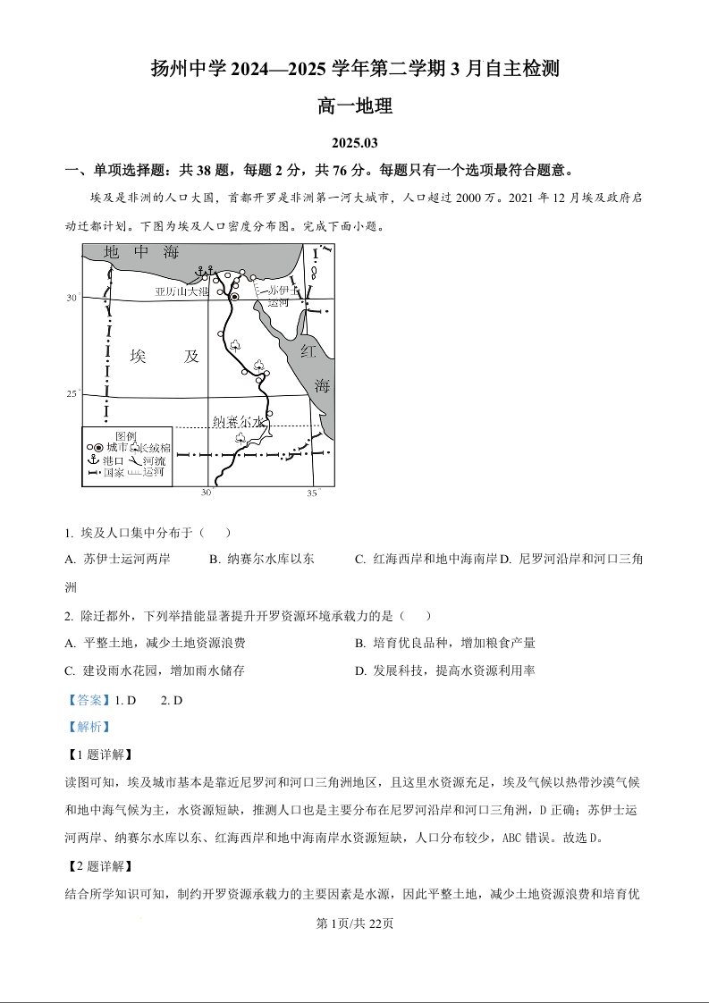 江苏省扬州中学2024-2025学年下学期3月高一月考地理(精品解析版)