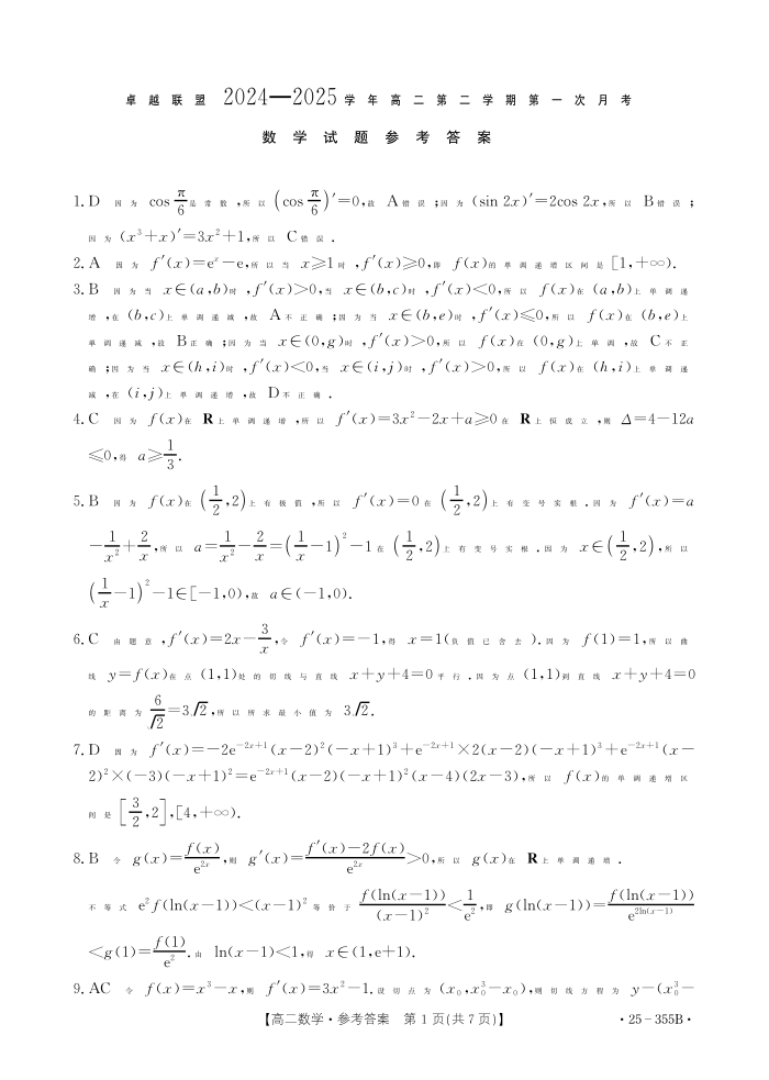 河北省邢台市卓越联盟2024-2025学年下学期3月高二第一次月考数学答案