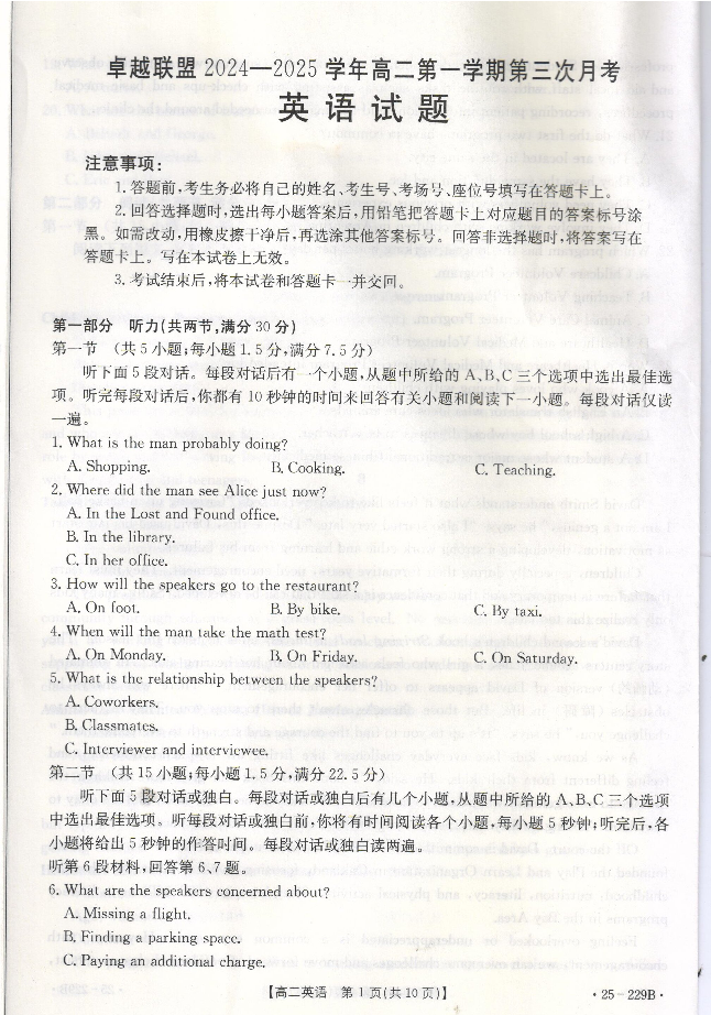 河北省邢台市卓越联盟2024-2025学年下学期3月高二第一次月考英语