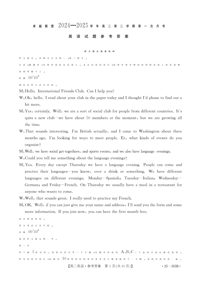 河北省邢台市卓越联盟2024-2025学年下学期3月高二第一次月考英语答案