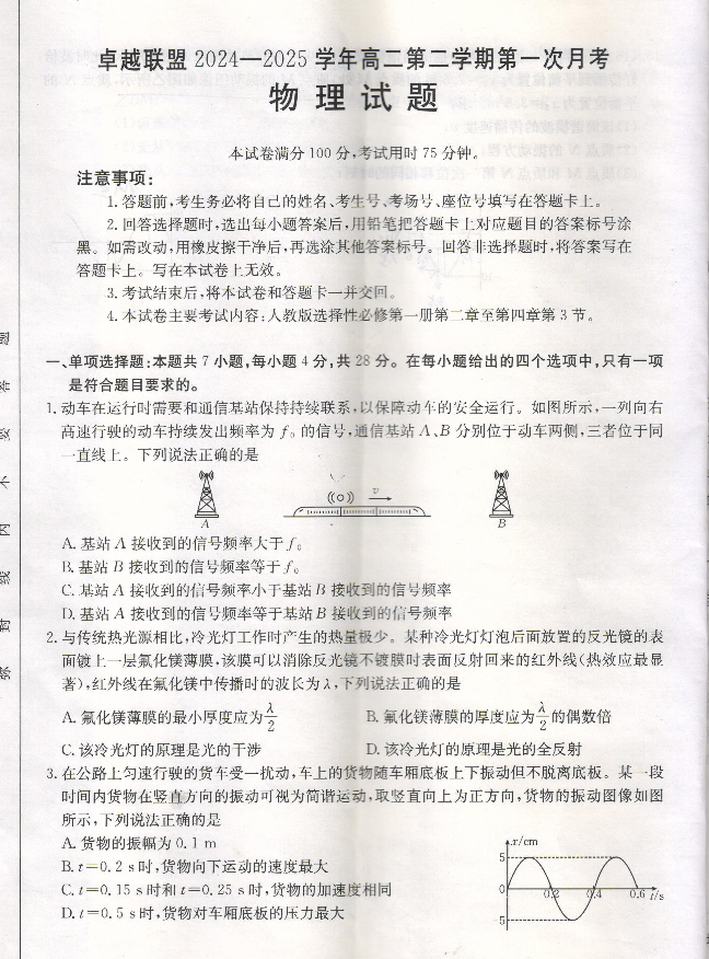河北省邢台市卓越联盟2024-2025学年下学期3月高二第一次月考物理