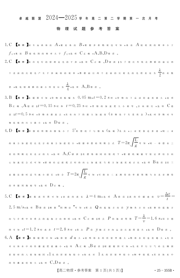 河北省邢台市卓越联盟2024-2025学年下学期3月高二第一次月考物理答案