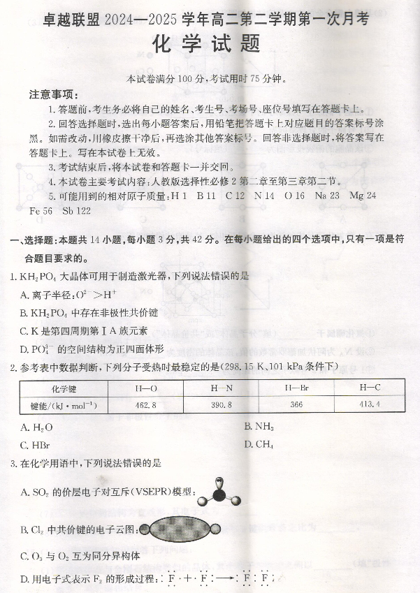 河北省邢台市卓越联盟2024-2025学年下学期3月高二第一次月考化学