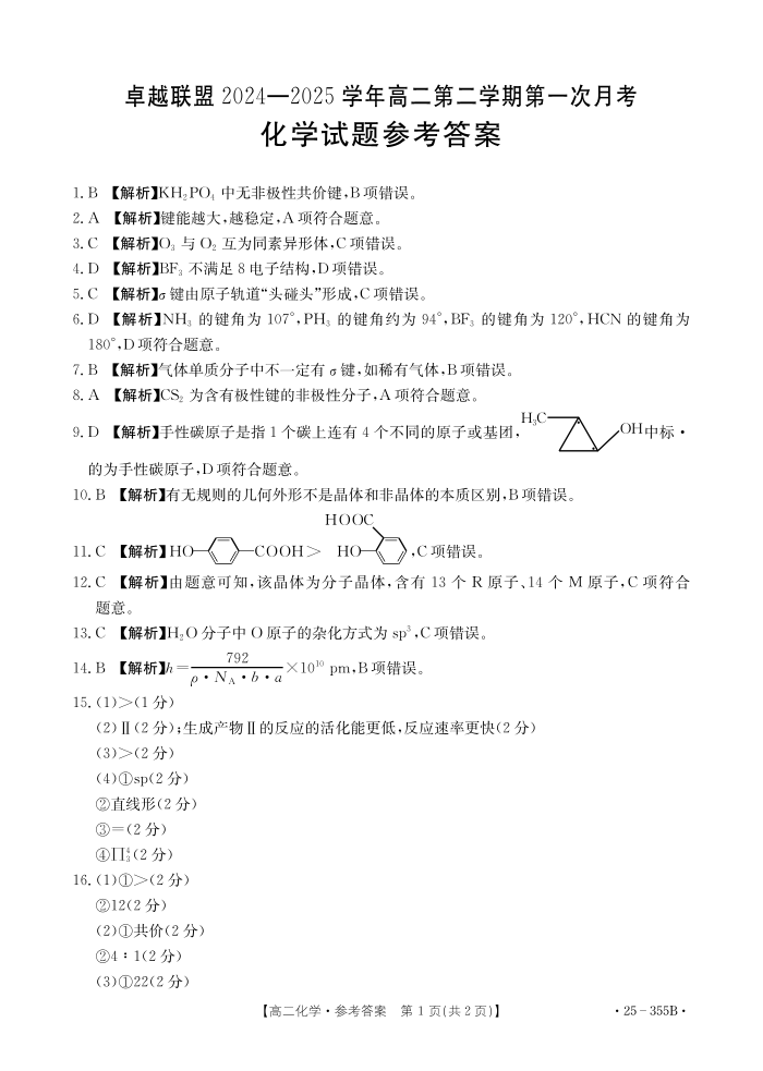 河北省邢台市卓越联盟2024-2025学年下学期3月高二第一次月考化学答案