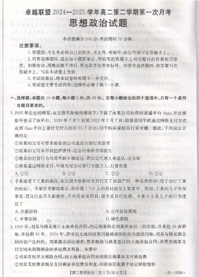 河北省邢台市卓越联盟2024-2025学年下学期3月高二第一次月考政治
