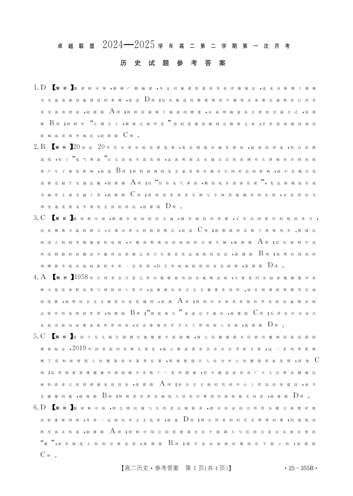 河北省邢台市卓越联盟2024-2025学年下学期3月高二第一次月考历史答案