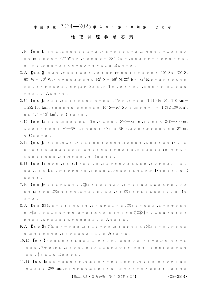 河北省邢台市卓越联盟2024-2025学年下学期3月高二第一次月考地理答案
