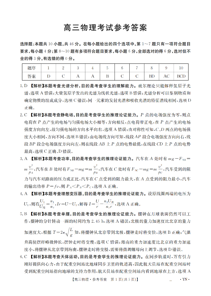 云南省区域高中2024-2025学年下学期3月高三联考物理答案