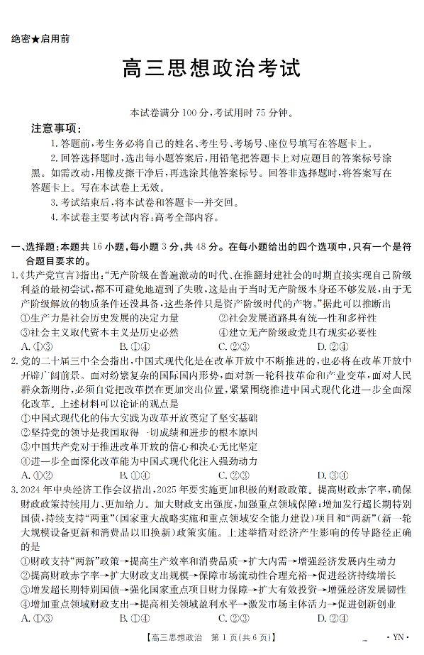 云南省区域高中2024-2025学年下学期3月高三联考政治