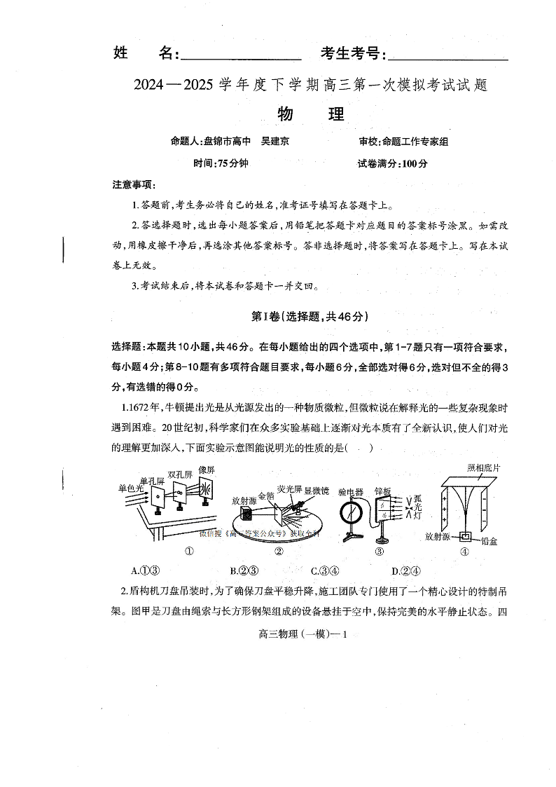 辽宁省重点高中协作校2024-2025学年下学期高三第一次模拟物理+答案