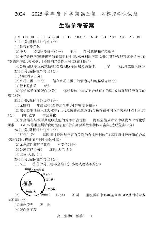 辽宁省重点高中协作校2024-2025学年下学期高三第一次模拟生物答案