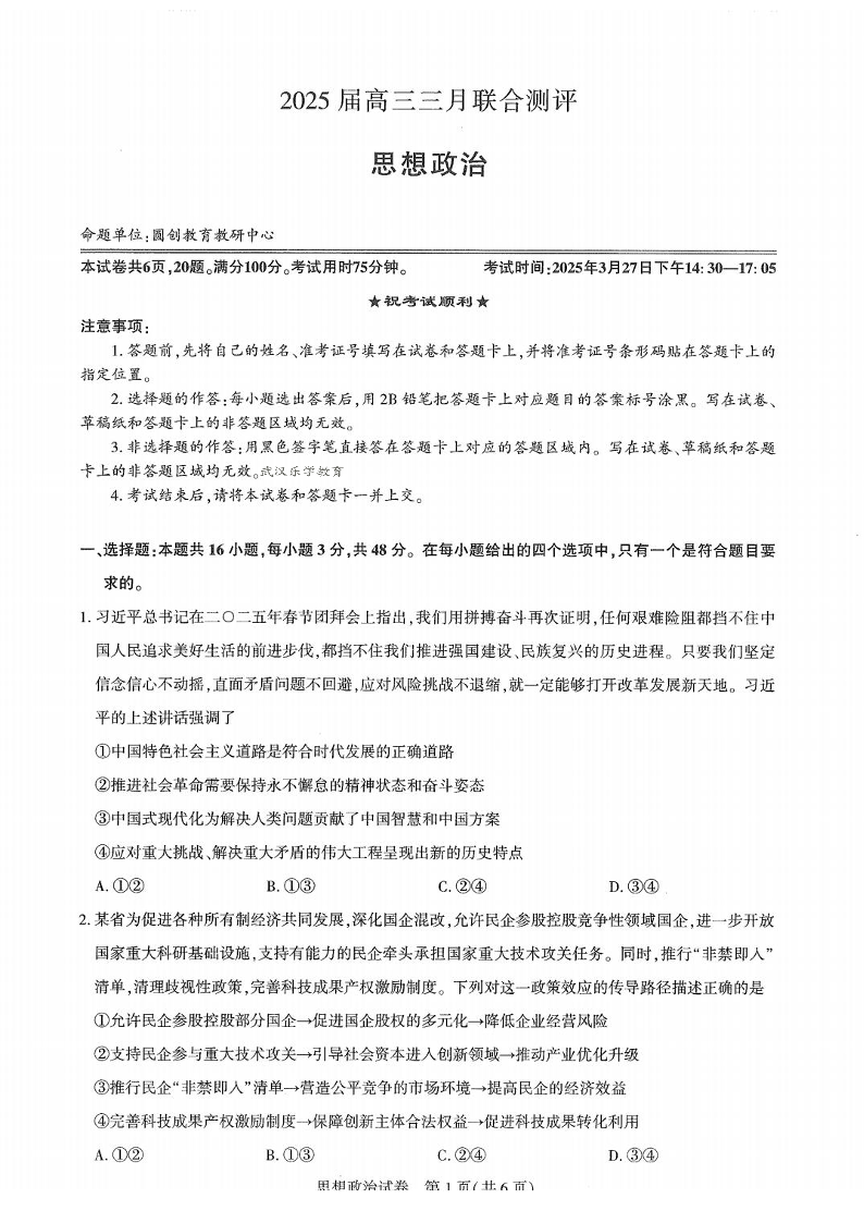 湖北省圆创教育教研中心2024-2025学年下学期3月高三联合测评政治