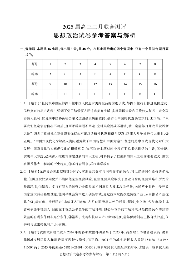 湖北省圆创教育教研中心2024-2025学年下学期3月高三联合测评政治答案