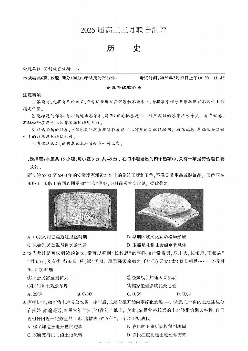 湖北省圆创教育教研中心2024-2025学年下学期3月高三联合测评历史