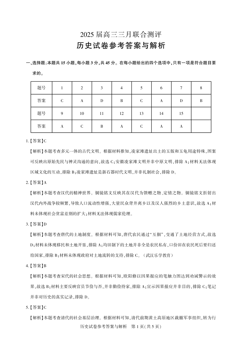 湖北省圆创教育教研中心2024-2025学年下学期3月高三联合测评历史答案