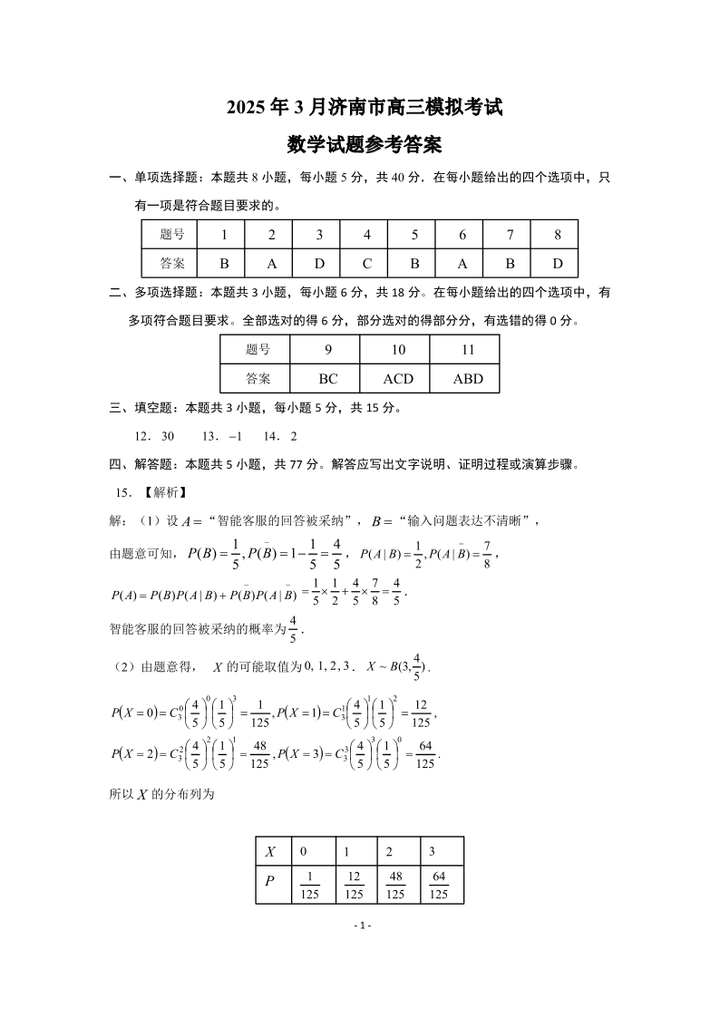 山东省济南市2024-2025学年下学期3月高三一模统考数学答案