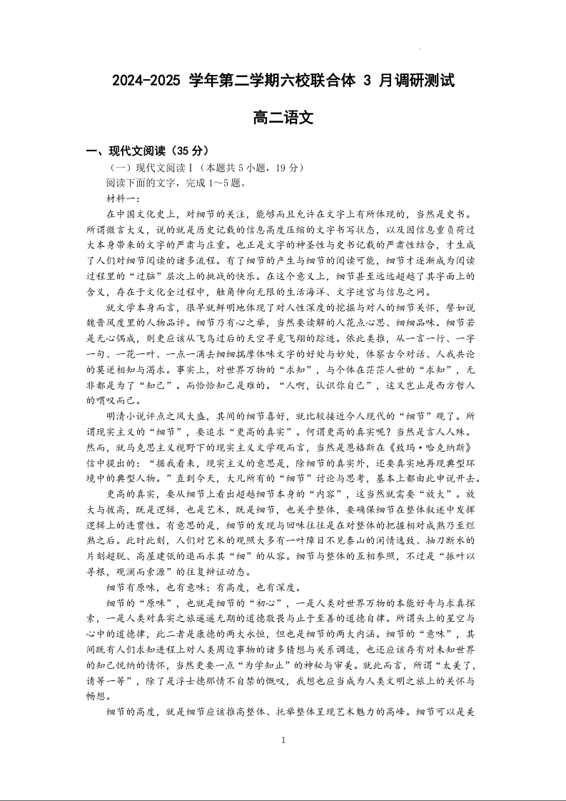 江苏省南京市六校2024-2025学年下学期3月高二联合调研语文