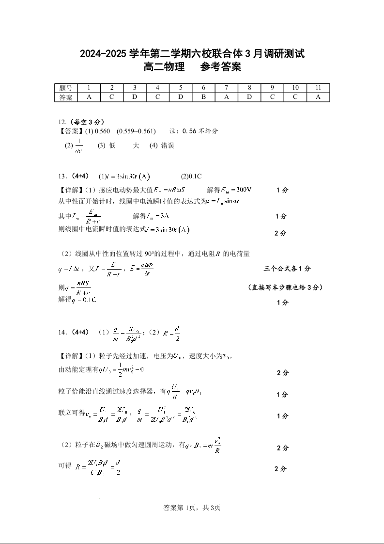 江苏省南京市六校2024-2025学年下学期3月高二联合调研物理答案