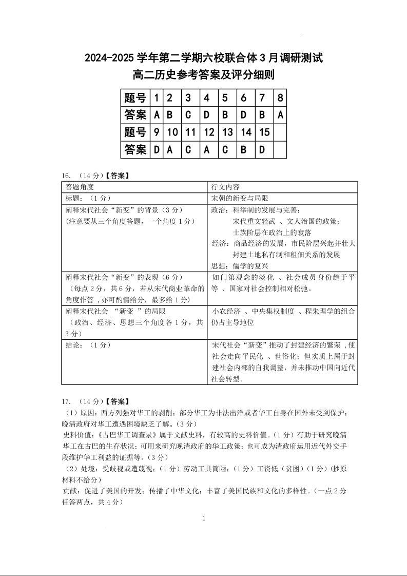江苏省南京市六校2024-2025学年下学期3月高二联合调研历史答案