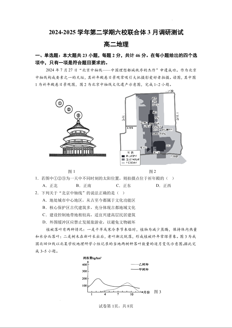 江苏省南京市六校2024-2025学年下学期3月高二联合调研地理