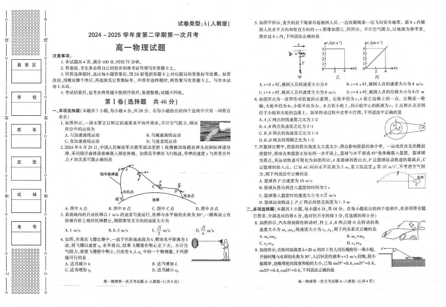 陕西省区域高中2024-2025学年下学期3月高一第一次联考物理+答案
