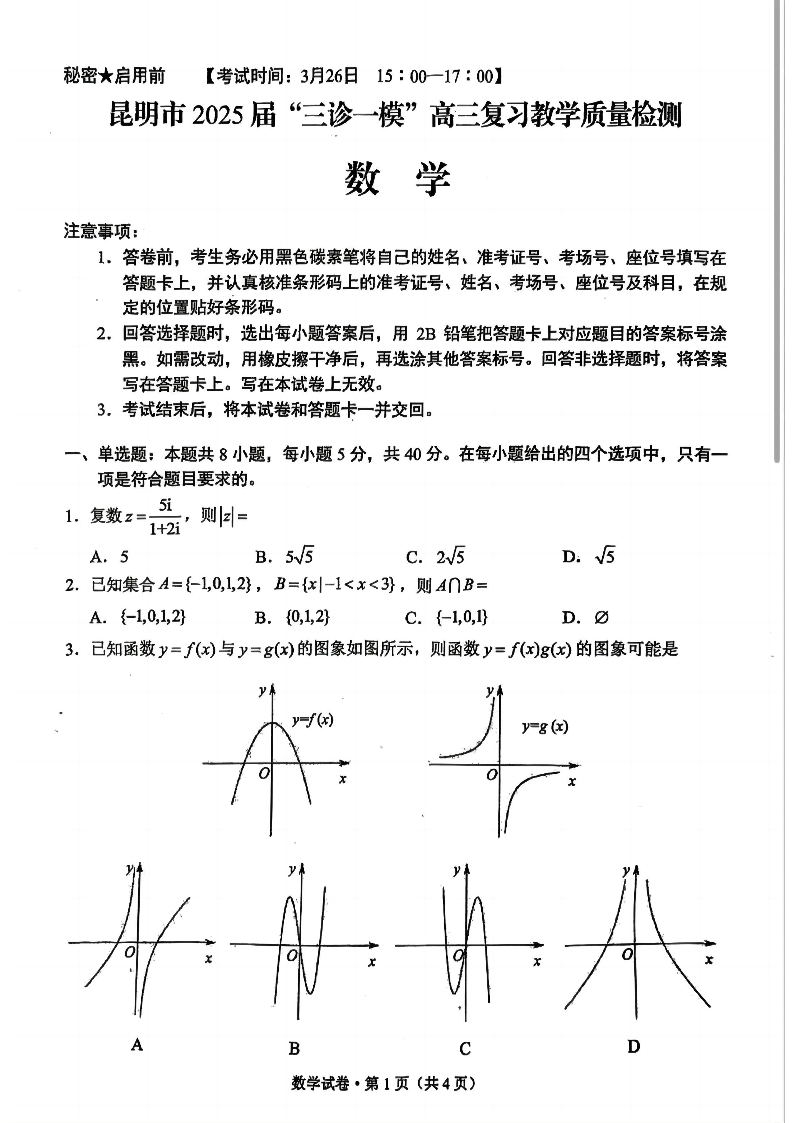 云南省昆明市2024-2025学年“三诊一模”高三复习教学质量检测数学