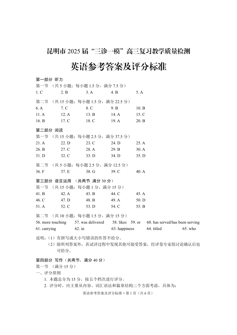 云南省昆明市2024-2025学年“三诊一模”高三复习教学质量检测英语答案