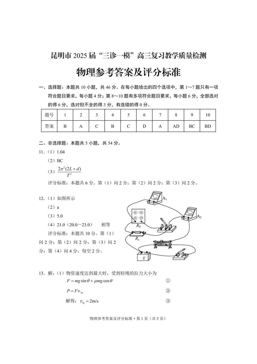 云南省昆明市2024-2025学年“三诊一模”高三复习教学质量检测物理答案